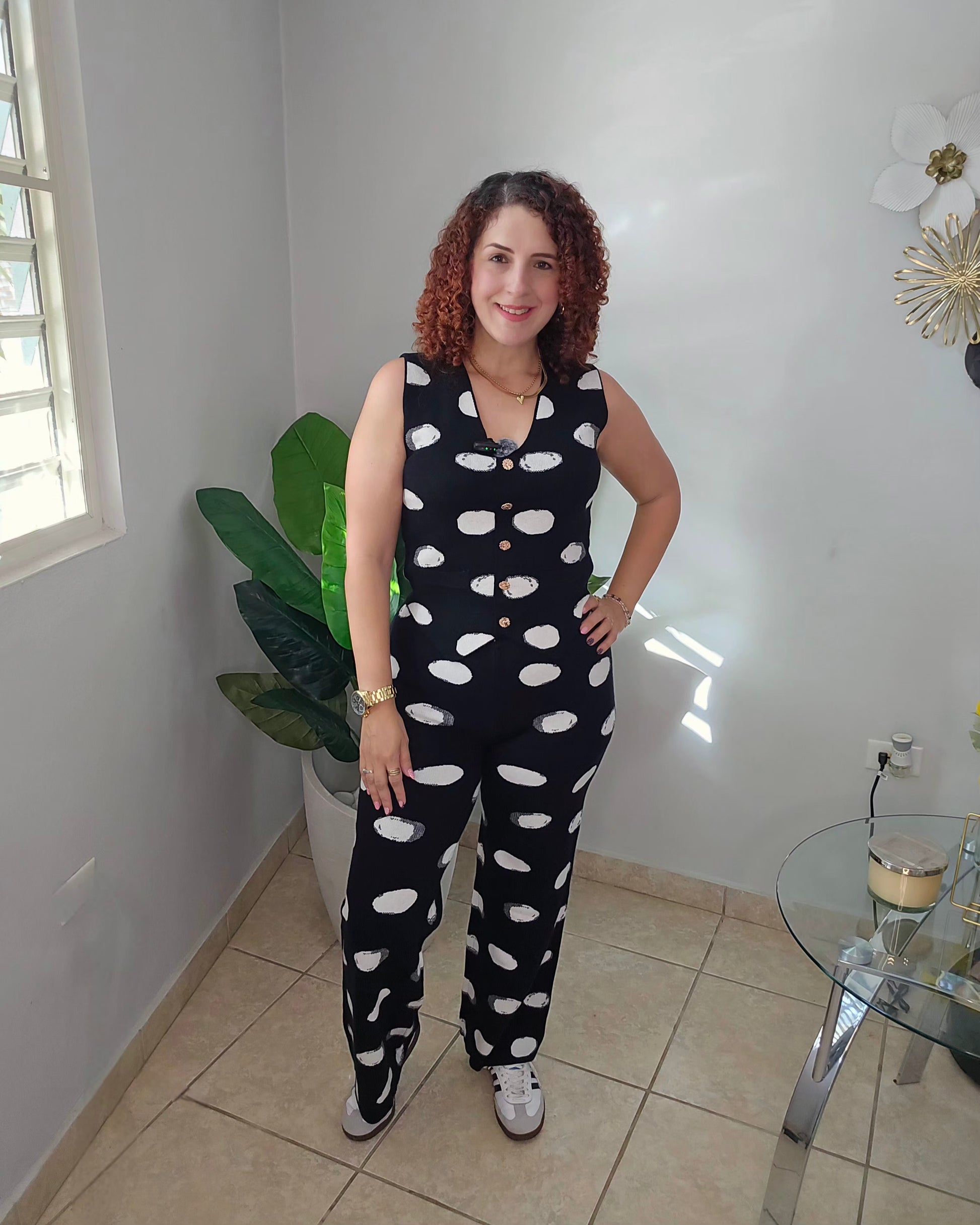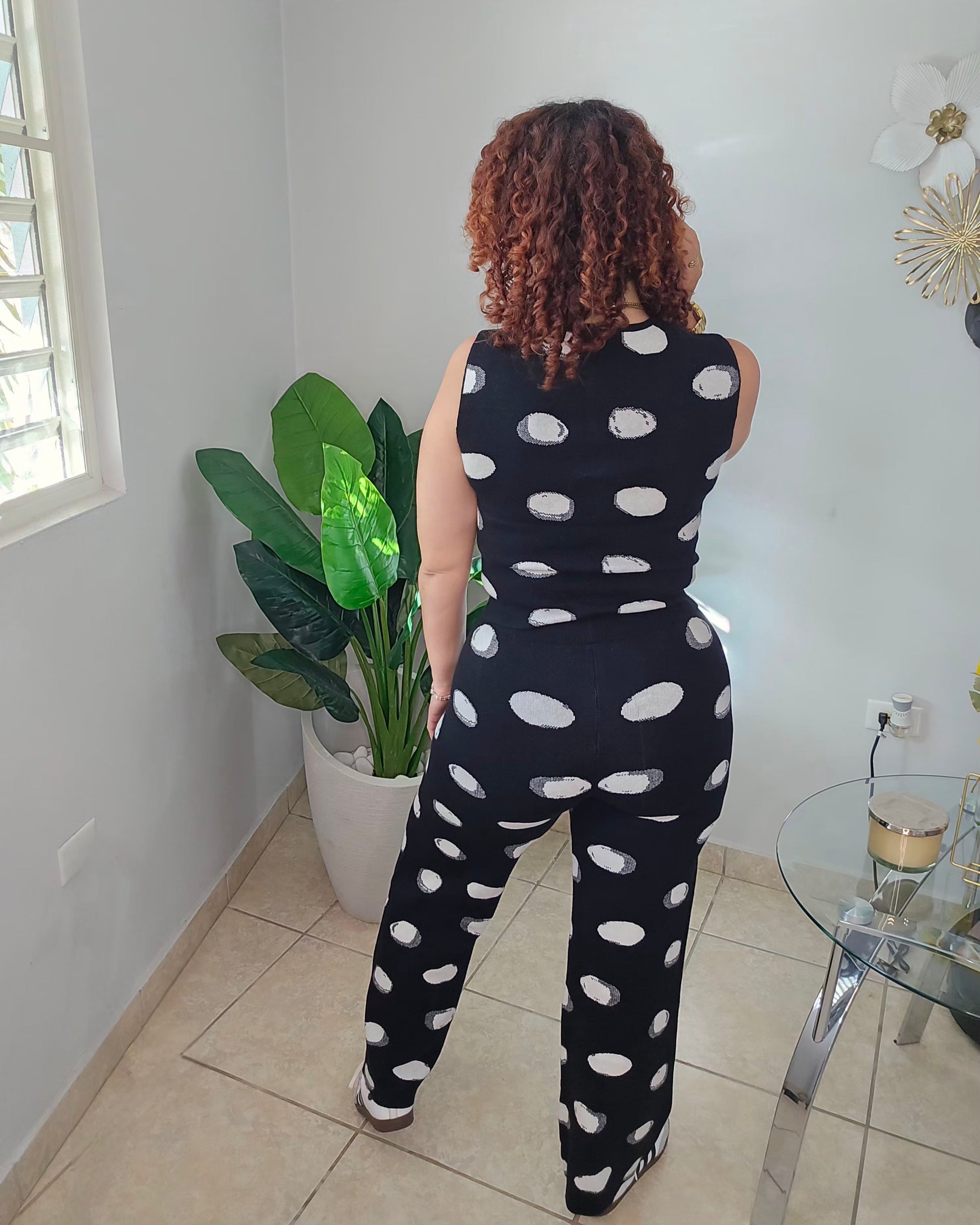 ¡Luce a la moda con este increíble set de dos piezas, que abraza la tendencia de los polka dots! Este conjunto elegante y cómodo en colores negro y blanco presenta un top sin mangas con detalle de botones decorativos y un pantalón de corte recto, ambos con un vibrante estampado de puntos irregulares. Es la pieza perfecta para un look casual pero sofisticado, que puedes combinar fácilmente con tus accesorios favoritos.