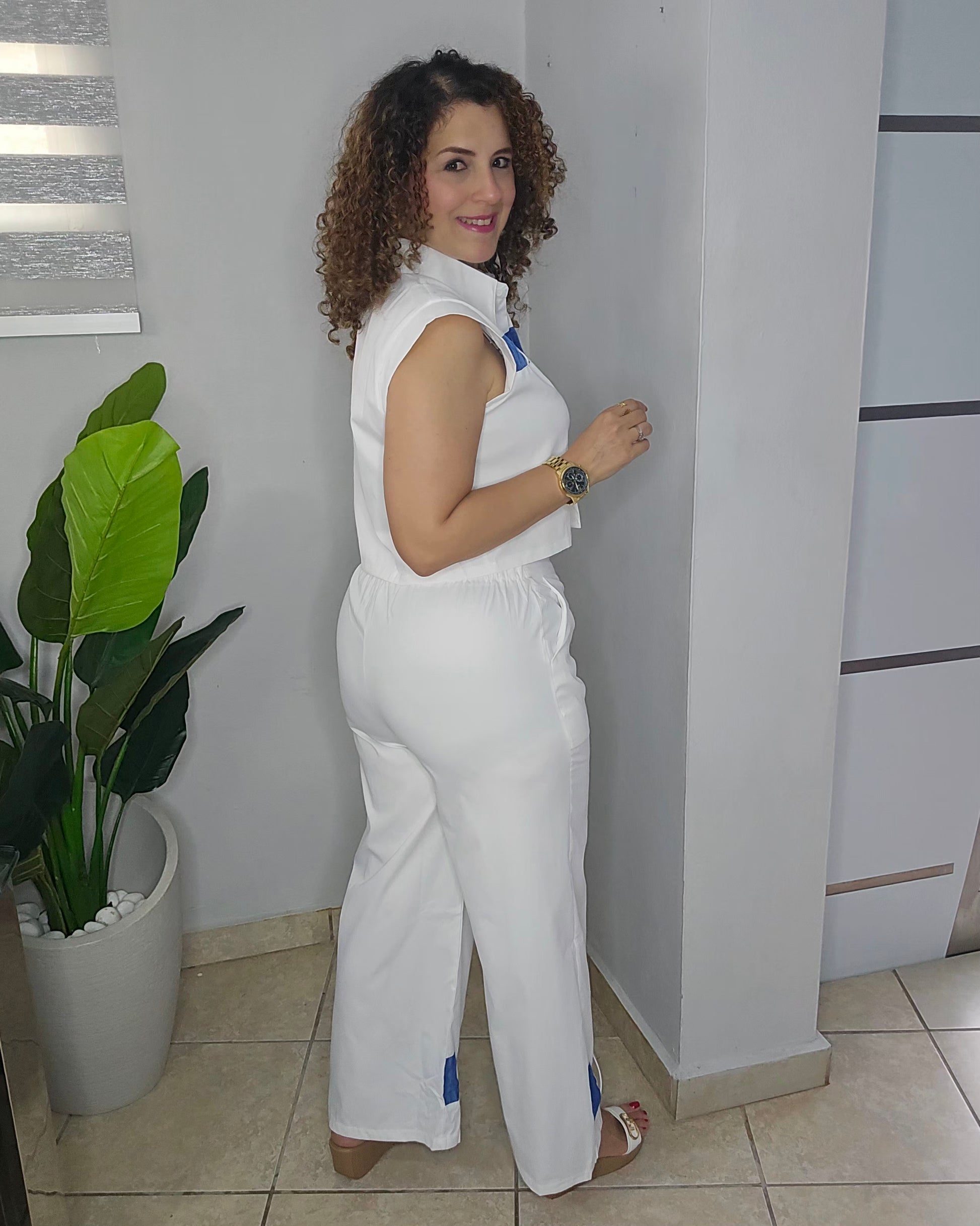 Set blanco con detalles en azul que aportan un toque elegante y diferente. La blusa estructurada eleva el look, mientras el pantalón de pierna ancha estiliza y brinda comodidad.